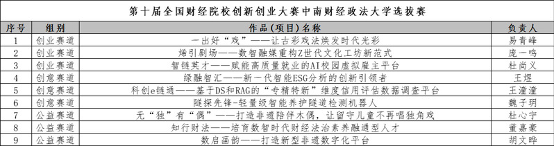 根据《关于举办第十届全国财经院校创新创业大赛中南财经政法大学选拔赛的通知》相关要求,经团队自主申报、评审老师打分等环节,共遴选出9个项目推送至全国财经院校创新创业大赛组委会。现将项目情况及具体名单公示如下:
