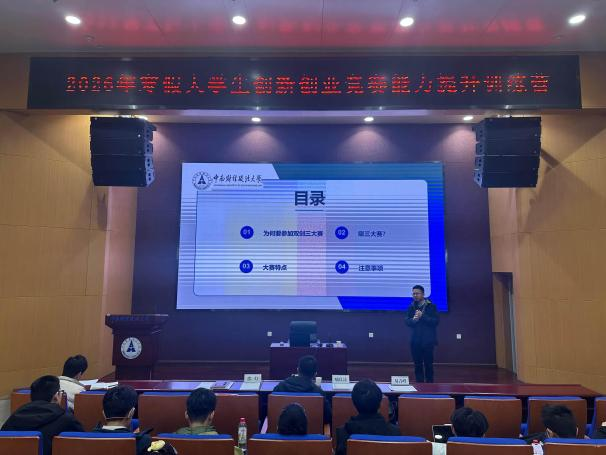 1月13日至14日,训练营聚焦赛事基础认知与实战分享开展赋能活动,一方面帮助同学们掌握大赛基本情况、建立系统认知,另一方面通过实战分享让大家直观感受赛事流程与氛围。活动邀请武汉光电工业技术研究院马宏飞老师、武汉大学张沪寅老师、四川大学吴迪老师、江苏大学刘赛老师以及学校喻良涛、熊灯老师等多名校内外专家,围绕赛事规则、备赛要点、路演技巧等内容授课。